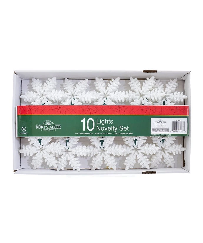 Add to the lighting of your holiday or winter party décor with this white snowflake light set by Kurt Adler! Each of the 10-light covers in this novelty light set features a beautiful shimmering, textured white snowflake design that is sure to bring a wintry touch to your decor.