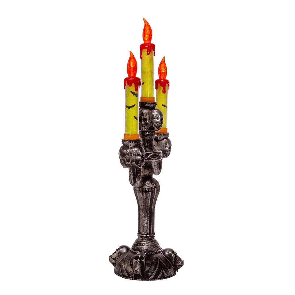 This Kurt Adler battery-operated Halloween LED Candelabra is a fun addition to your Halloween décor. If features 3 battery operated candles, with orange flames, dripping blood and bats set in a spooky dark grey candelabra decorated with skulls.