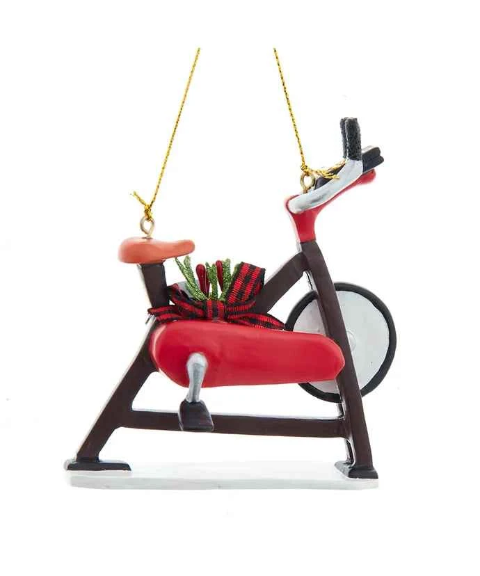 Kurt Adler’s exercise bicycle ornament is a unique addition to your holiday décor or Christmas tree. It features a red and black color scheme and is decorated with a red and black ribbon bow.