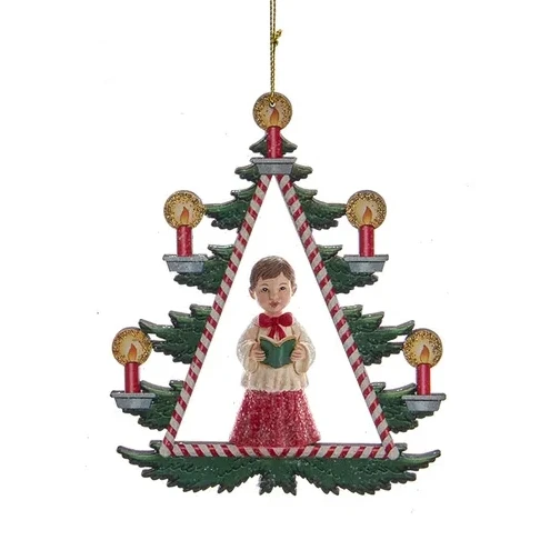 These German style choir boy and girl ornaments are a wonderful addition to any holiday décor or Christmas tree. This assortment features a choir girl standing in the center of a decorated Christmas tree and a choir boy also standing in the center of a decorated Christmas tree.