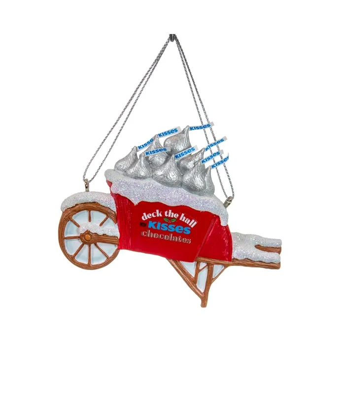 This Hershey’sâ„¢ Kisses wheelbarrow ornament from Kurt Adler are a fun and festive addition to any holiday décor or Christmas tree. It features a red “Merry Kissmass” wheelbarrow filled with glittered snow and silver Hershey’sâ„¢ Kisses.