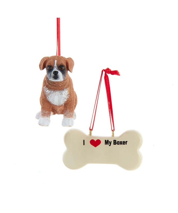 For the Boxer dog owner, this Kurt Adler dog and bone ornament set is perfect for you. It features a Boxer and an ” I Heart My Boxer” dog bone that can be written on for personalization.