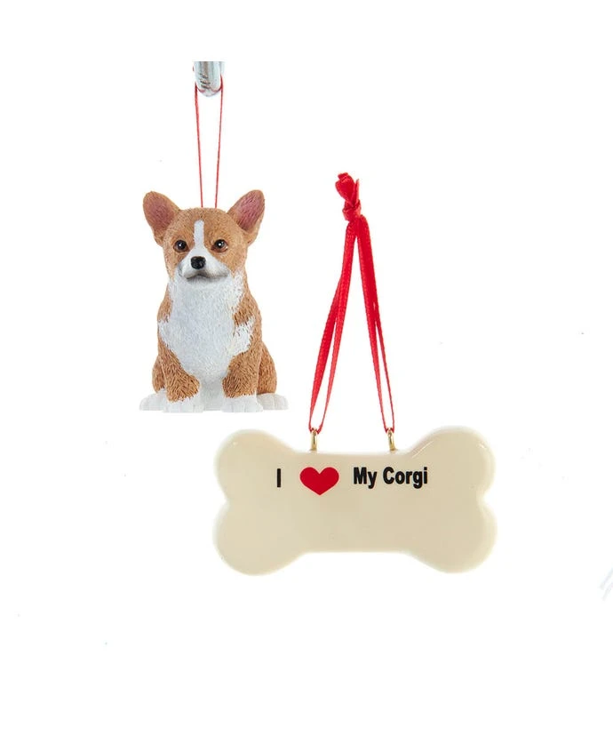 For the Corgi dog owner, this Kurt Adler dog and bone ornament set is perfect for you. It features a Corgi and an ” I Heart My Corgi” dog bone that can be written on for personalization.