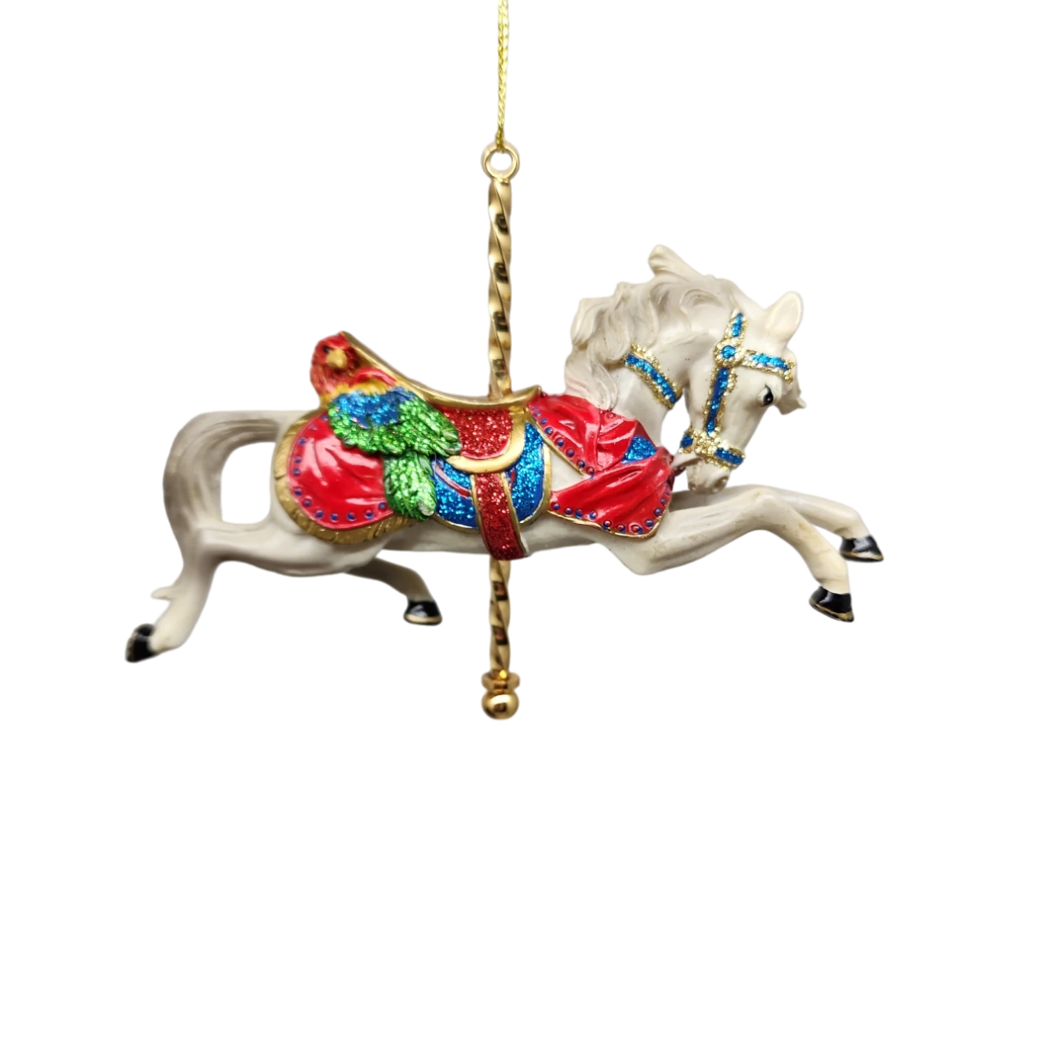 Handpainted Polyresin Ornament Depicts a lavish Carousel Animal, complete with Gold Twist Pole and Saddle.