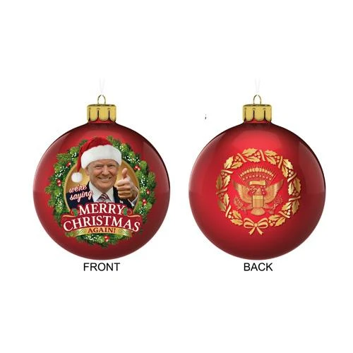 Show your support for our 45th President with this 80mm Glass President Trump Ball Ornament from Kurt Adler. Its all-red design features an image of President Trump with a thumbs up and Christmas hat. He is accompanied by the words, ” We’re saying Merry Christmas again.”