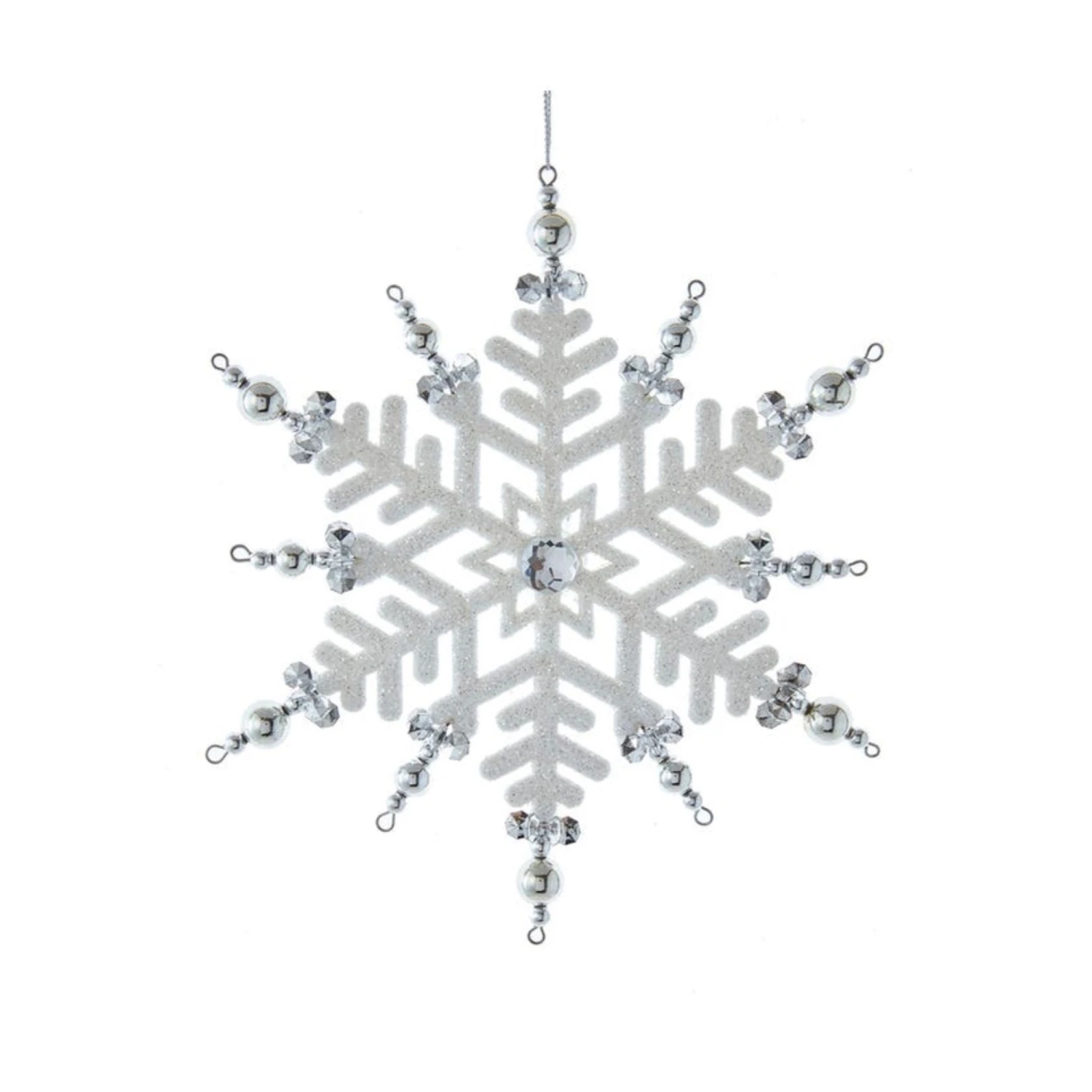 This white glittered snowflake ornament from Kurt Adler is a festive addition to any holiday décor or Christmas tree. It features a clear gemstone center and silver beaded accents.